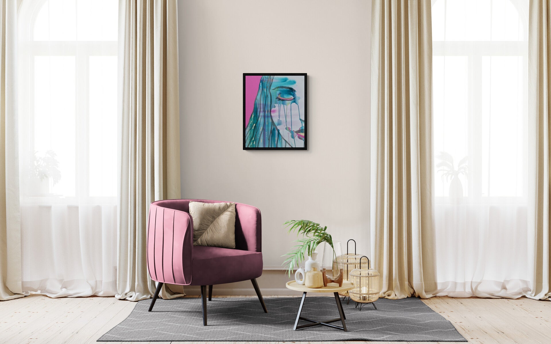 Akryl på lerret. 55x46 cm. Inkludert sort galleriramme. Prisen inkluderer 5% kunstavgift.