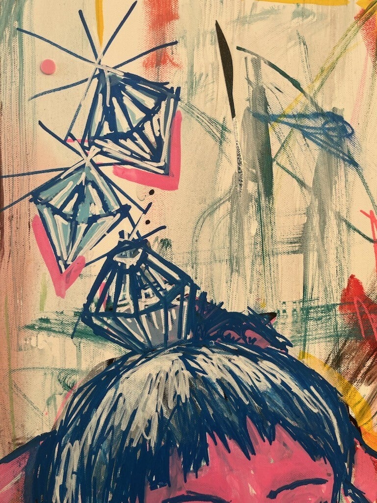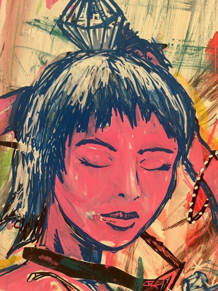 Akryl på lerret med innslag av collage. 70x70cm. Sort float-ramme er inkludert i prisen. Prisen inkluderer 5% kunstavgift.